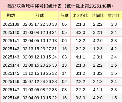 红球质合分析:上期红球质合比为1:5,合数出现比例较高。本期看好质合数出号超越,参考质合比3:3。