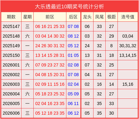 大小分析:近10期前区大小比为26:24,大数出现较为活跃。上期大小比为3:2,本期展望大数出现较为活跃,推选大小比为3:2。